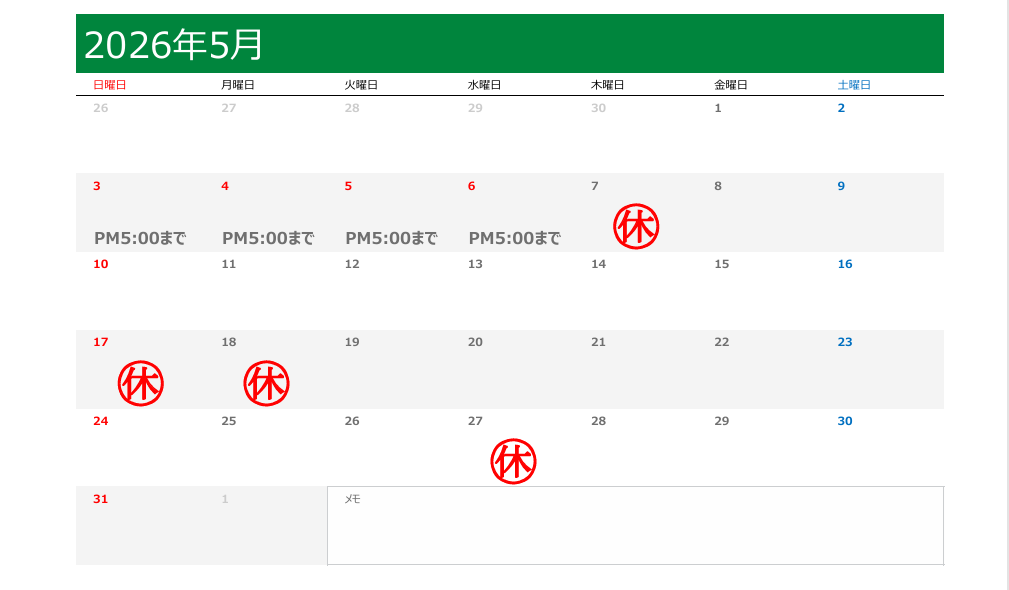 5月度の休業日のおしらせ